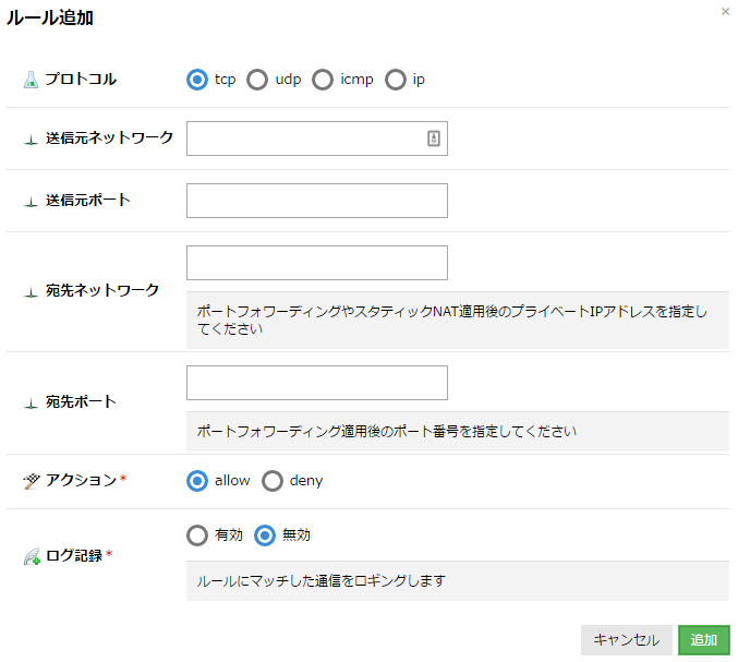 | 宛先のIPアドレス、もしくはネットワークを入力 ※ポートフォワーディングやスタティックNAT適用後のプライベートIPアドレス |