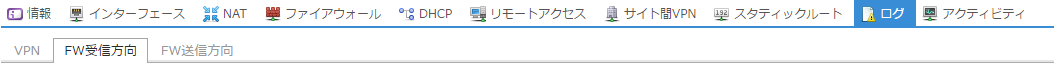 VPCルータの詳細画面にて「ログ」タブをクリックし、「FW受信方向」「FW送信方向」タブをクリックすると、ログが表示されます。