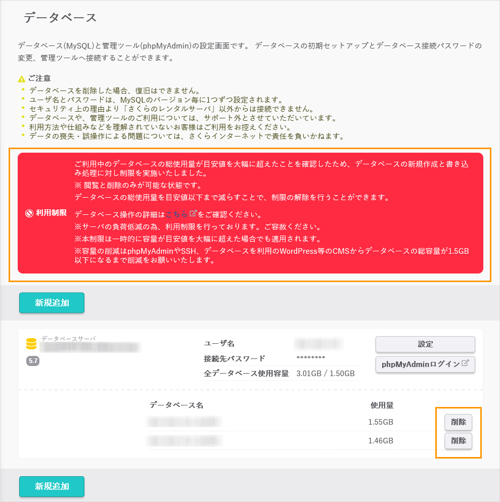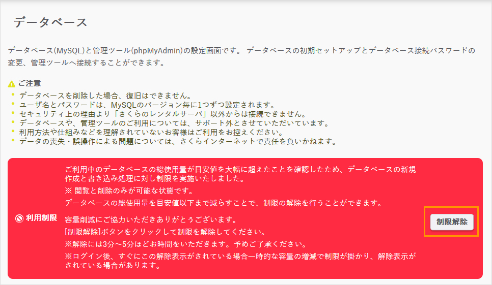 - 解除を行うには、データベースの使用容量を目安容量内に収まるようにお客様側で調整していただく必要がございます。