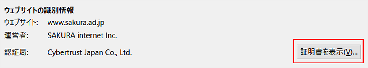 「安全な接続」-「詳細を表示」の順にクリックすると、以下のような画面が出現するため、「証明書を表示」をクリックします。