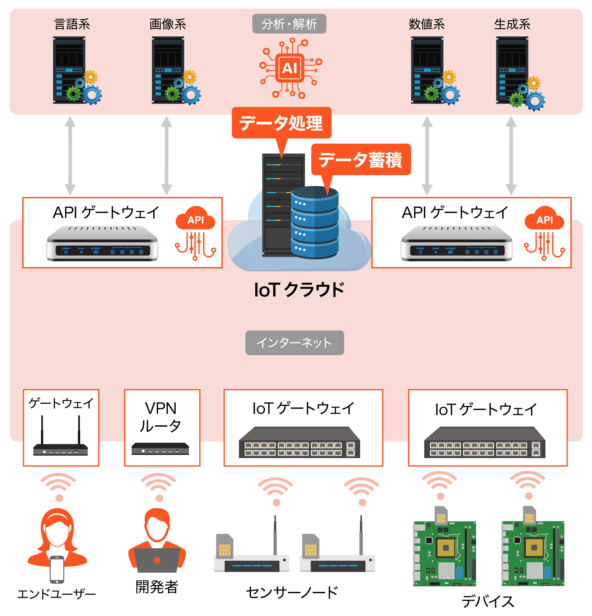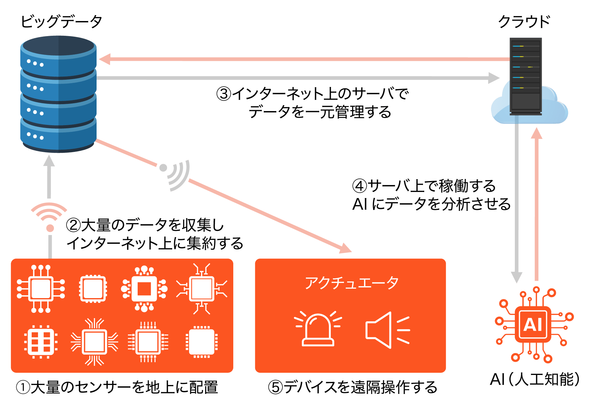 センサーやデバイスから収集したデータを処理し蓄積するのが主な役割です。例えばAIサービスとの連携でデータ分析や解析をしIoTクラウドに戻すことで蓄積したデータの価値が高まります。