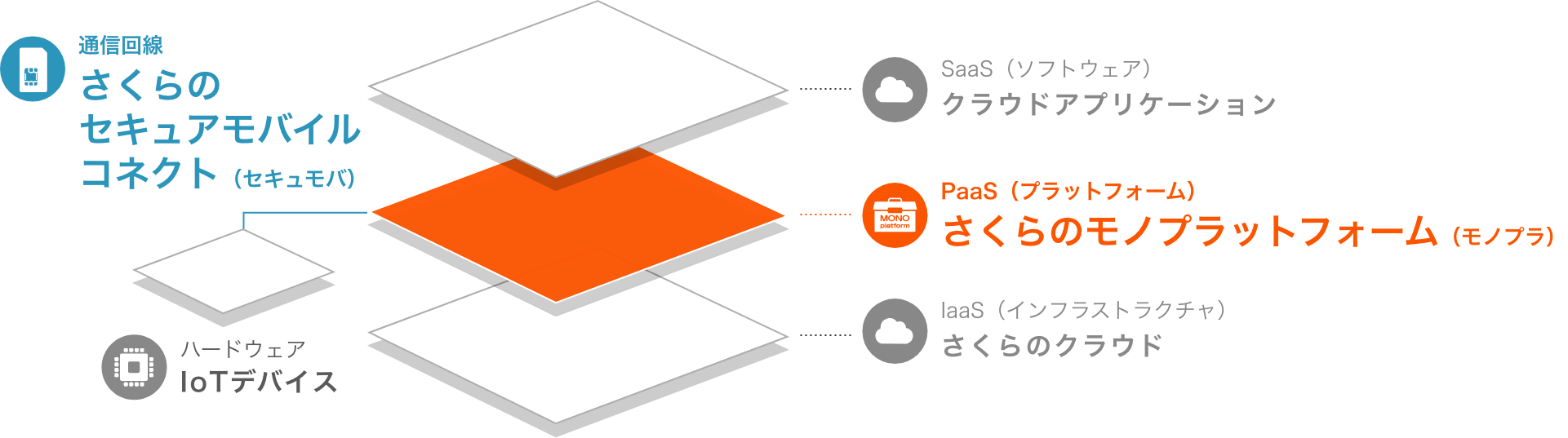 さくらのモノプラットフォームは、IoTシステム開発に必要なバックエンド機能の「プラットフォーム」、主にIoTデバイスの開発の参考となる情報を商用利用可能なMITライセンスで公開している「設計情報」、「さくらのセキュアモバイルコネクト」と統合されたマルチキャリア対応の安全なモバイル回線の「通信回線」を一貫して提供するIoTプラットフォームサービスです。
