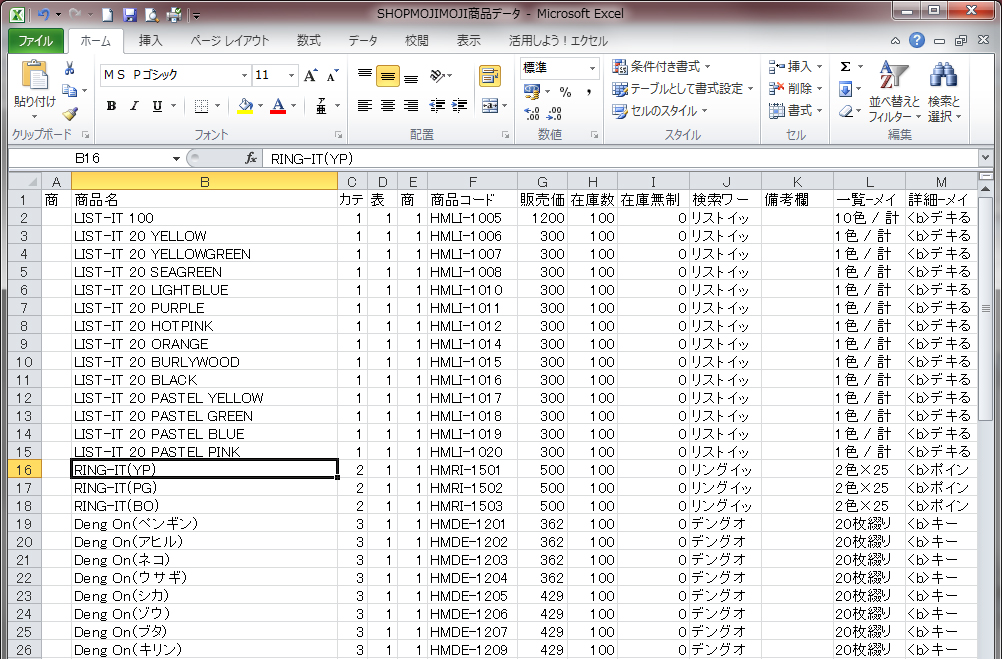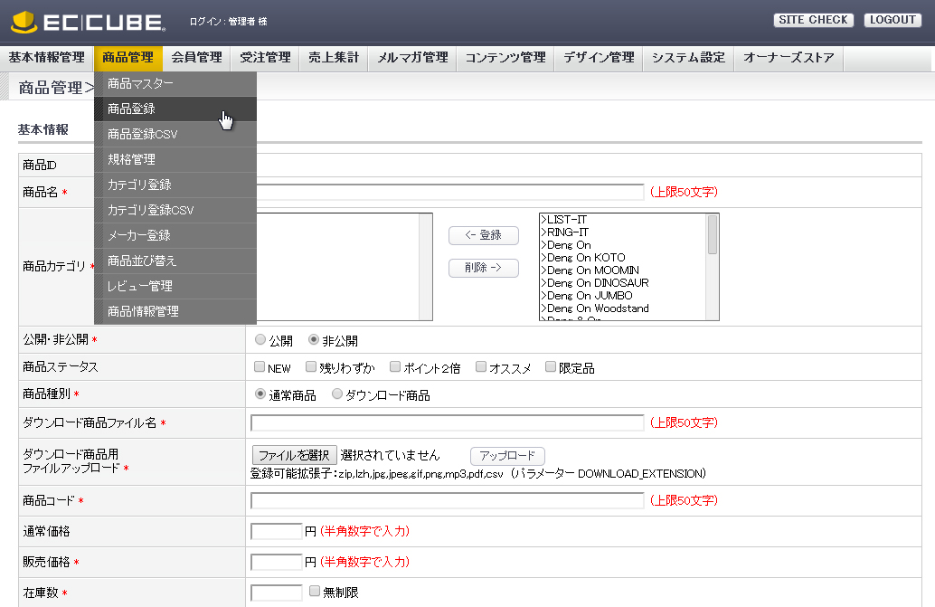 これはEC-CUBEだけの特長というわけではないですが、CSVファイルを用いた商品データの一括登録は本当に便利です。商品名や販売価格、「NEW」や「残りわずか」といったステータスをひとつのファイルで管理できますし、エクセルを開けば一覧性も高い。データに修正を加えたときも、手を加えていない部分も含めて、まるっとアップロードできる手軽さがあります。