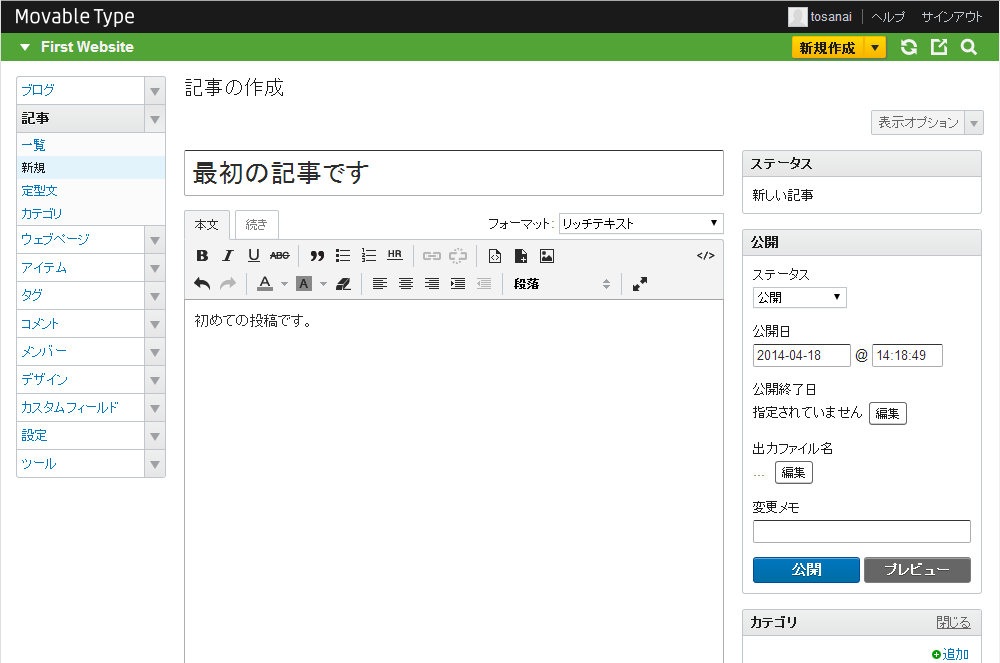 無事にMovable Typeにサインインできたら、最初の記事を投稿してみましょう。