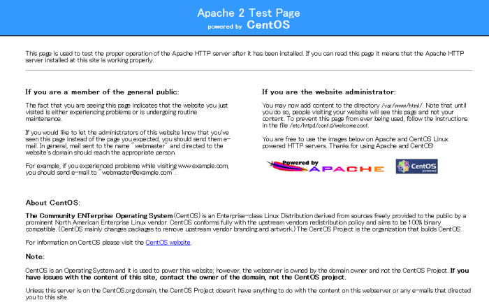 Apache の起動後、VPS に付与されているIPアドレス、もしくはドメイン名を指定してブラウザから閲覧してみます。Apache の初期画面が表示されたら、インストールは成功です。
