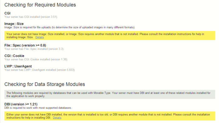 mt-chekc.cgi の実行画面中、黄色のメッセージで表示されているのは、まだサーバーにインストールされていない Perl のモジュールです。これらのモジュールは、後ほどインストールしていきます。