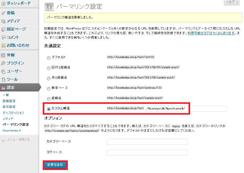 - 「カスタム構造」のラジオボタンをクリックし、「/%category%/%postname%」と入力し、「変更を保存」ボタンを押下します。