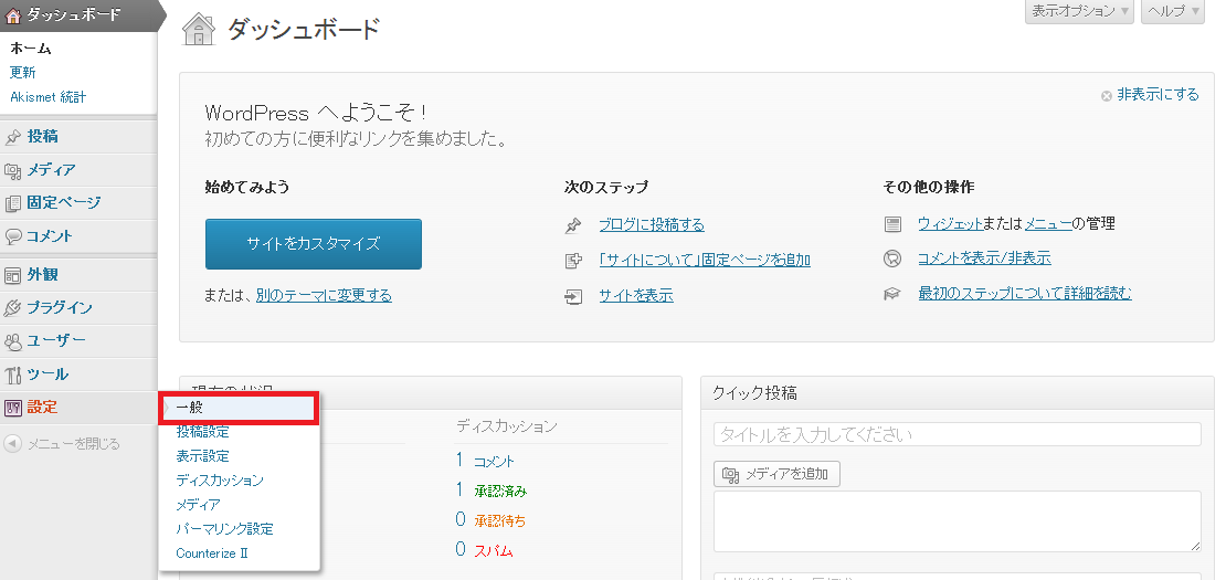 - WordPressの管理画面 左側のメインメニューの「設定>一般」をクリックします。