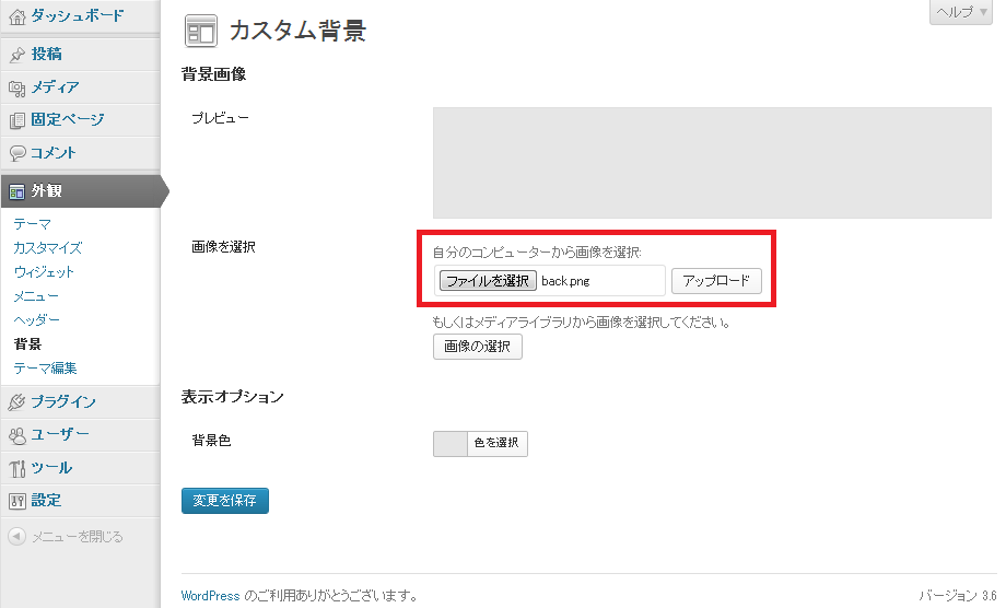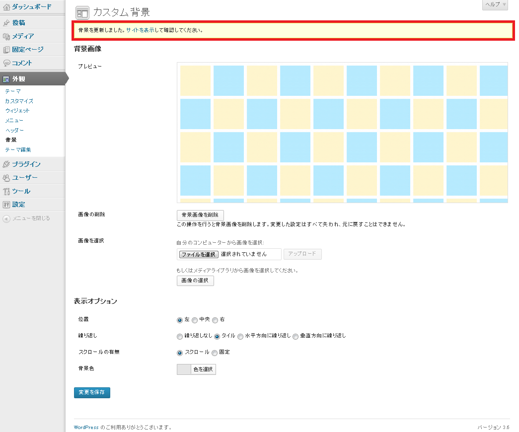 - WordPressの管理画面 左側のメインメニューの「外観>背景」をクリックします。