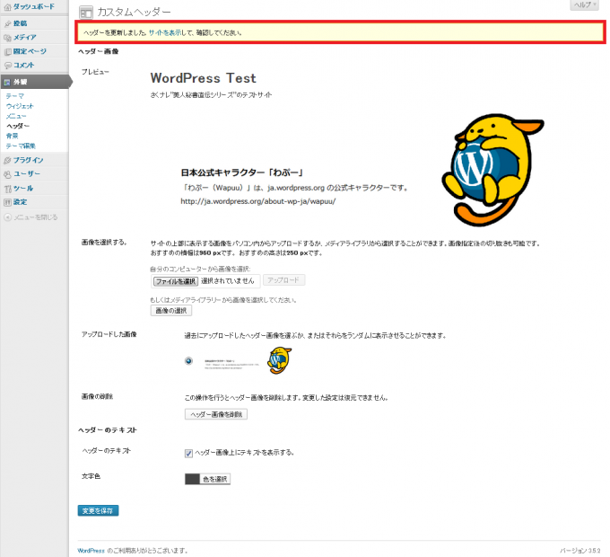 - WordPressの管理画面 左側のメインメニューの「外観>ヘッダー」をクリックします。