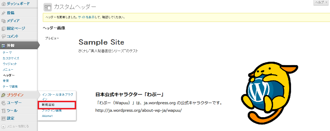 - 左側のメインメニューの「プラグイン>新規追加」をクリックします。