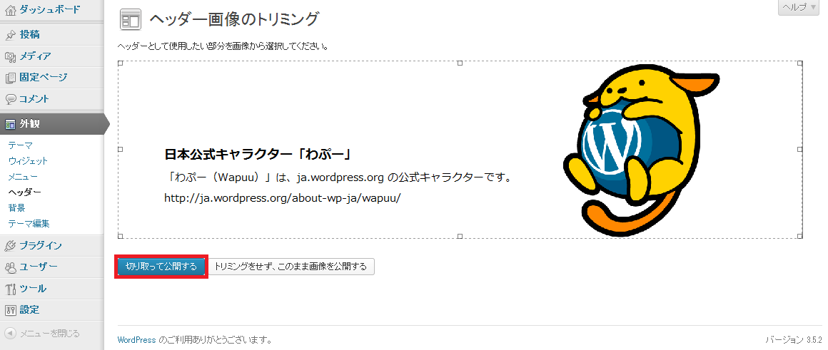 - 必要に応じてヘッダー画像をトリミングし、「切り取って公開する」(または「トリミングせず、このまま画像を公開する」)ボタンを押下します。