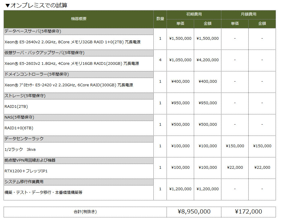 オンプレミスでのコストを試算してみると、以下のようになりました。