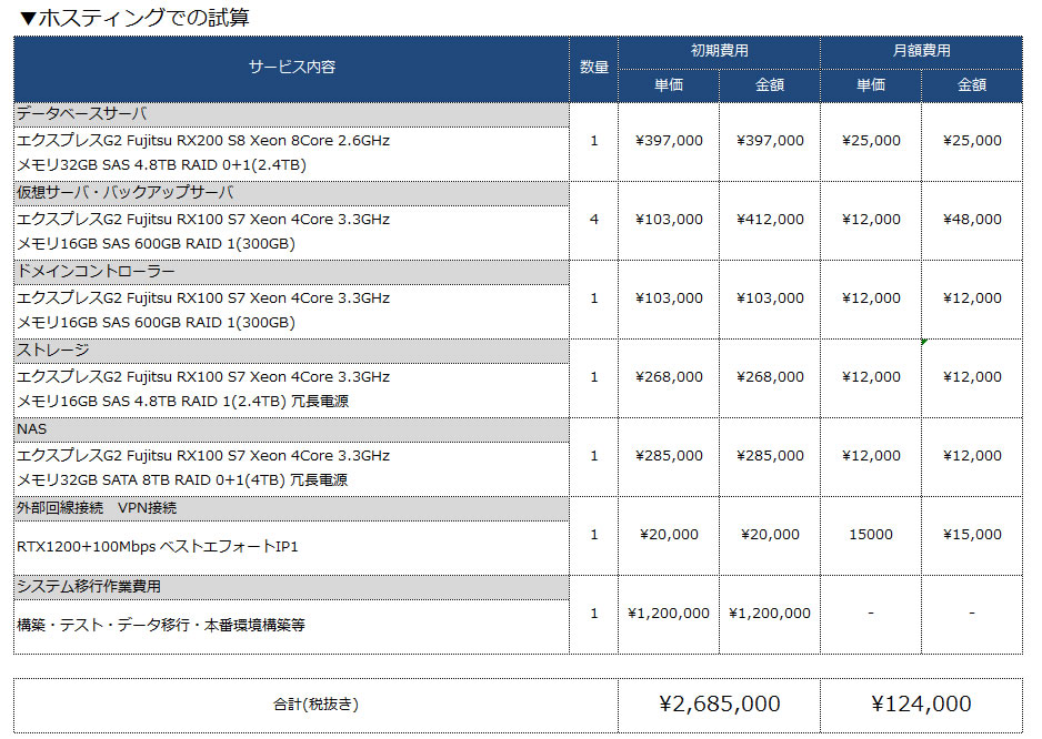 対して、当社の「さくらの専用サーバ」によるホスティング構築をした場合の試算が、以下の通りです。