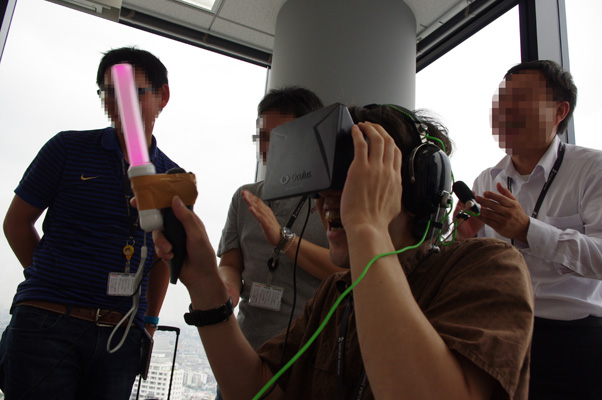 ちなみにここで手に持っているのは Oculus Rift とはまた別の装置で、「これを振ると仮想空間内でサイリウムが振れる」という代物。しかし、手元が見えないのに本物のサイリウムが付いているあたり、謎のこだわりを感じます。