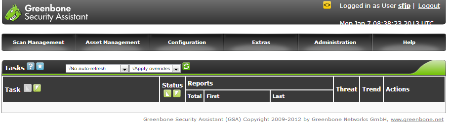 ここでopenvas-setupコマンドで設定したユーザー名およびパスワードを入力してログインすると、「Tasks」画面が表示される(図2)。OpenVASではスキャン設定を「Task(タスク)」と呼び、この画面では登録されているタスク一覧が表示される。