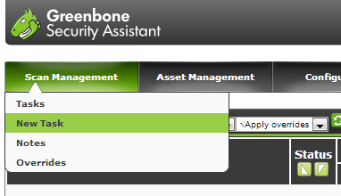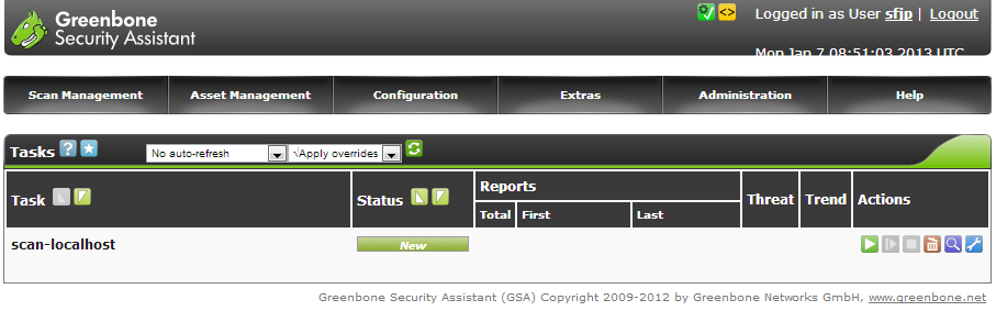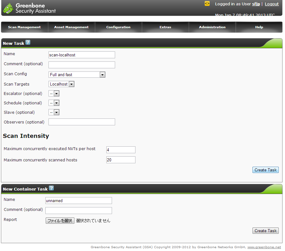 初期状態ではタスクは登録されていないので、まずローカルホストをスキャンするタスクを登録してみよう。タスクを登録するには、「Scan Management」メニューの「New Task」を選択する(図3)。