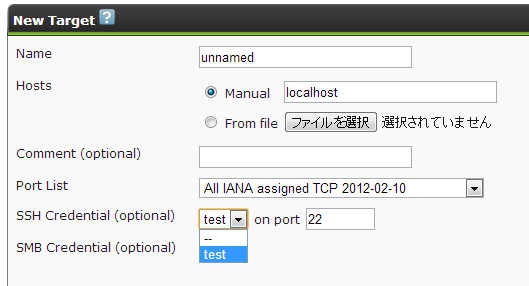ここで「Name」にはターゲット名を、「Hosts」には対象ホストのホスト名を、「Port List」にはスキャン対象とするポートを指定できる。「Hosts」で「From file」を選択し、ホスト名が列挙されたテキストファイルを指定することで複数のホストを登録することも可能だ。必要な情報を入力し、最後に「Create Target」をクリックするとターゲットが追加される。