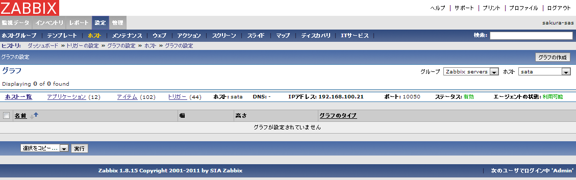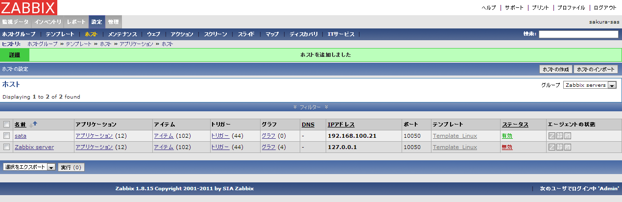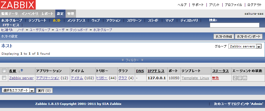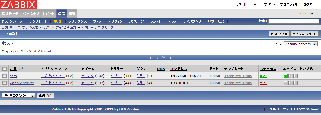 Webフロントエンドにログインし、メニュー内の「設定」、「ホスト」を順にクリックする。「ホストの設定」画面が表示されるので、「ホストの作成」ボタンをクリックしよう(図11)。