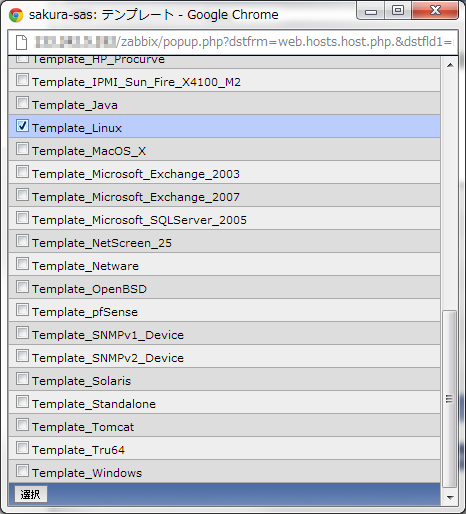 監視する項目は「テンプレート」で指定する。画面右の「リンクしているテンプレート」欄にある「追加」をクリックすると、テンプレート一覧がポップアップする(図13)。あらかじめさまざまな環境に向けたテンプレートが用意されているが、今回はLinuxサーバーが対象なので「Template_Linux」にチェックを入れ、「選択」をクリックする。