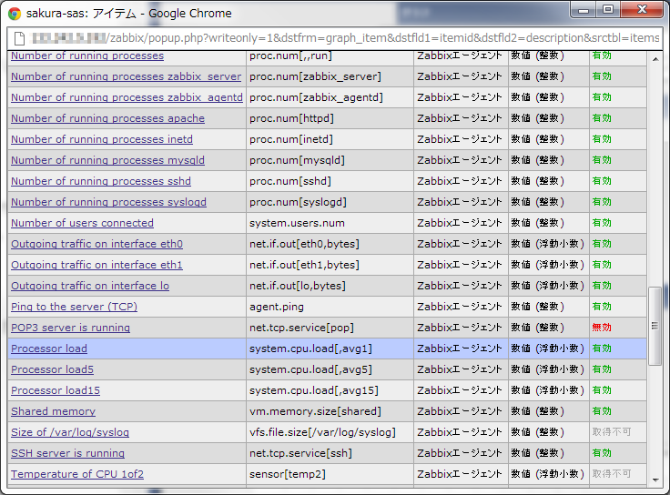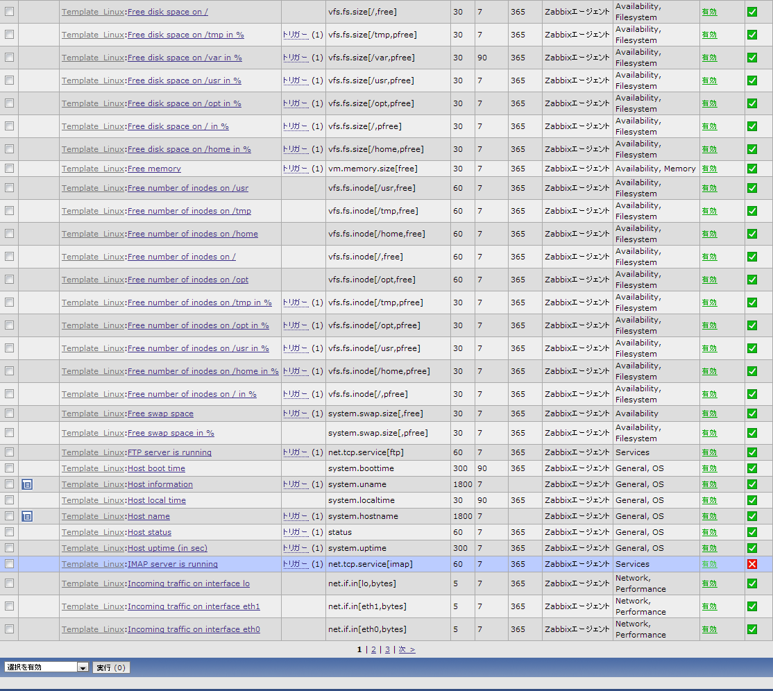 すると「アイテムの設定」画面が開き、設定項目一覧が表示される。ここで問題のある項目を探し、「有効」をクリックすることでその監視項目を無効にできる(図17)。