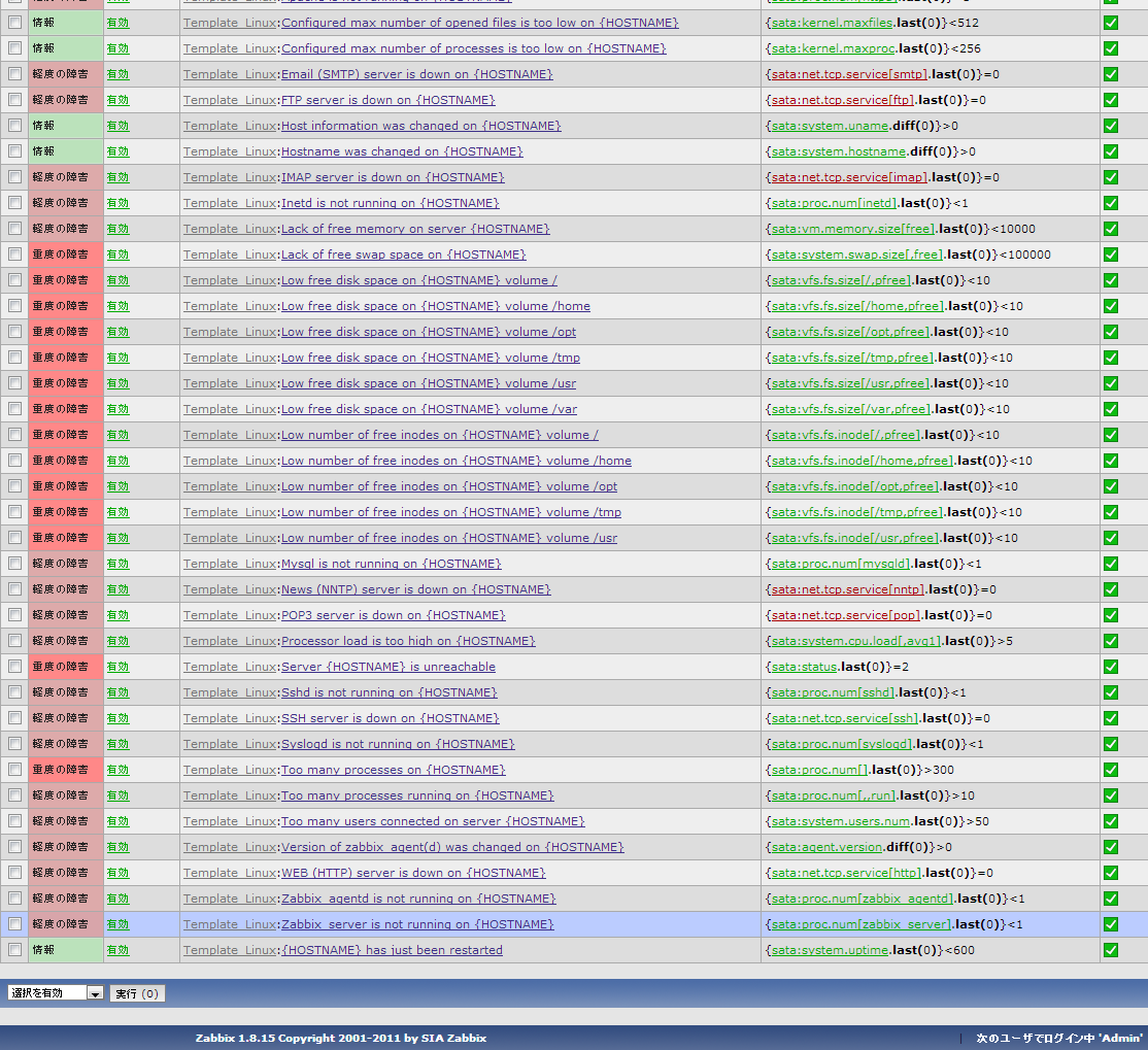 Zabbixでは、監視項目を先ほどの「アイテム」で管理し、その監視項目の出力結果が異常である場合に警告メッセージを表示する。この警告メッセージやその発生条件は「トリガー」として定義されており、たとえば「Zabbix_server is not running on {HOSTNAME}」というトリガーには「{sata:proc.num[zabbix_server].last(0)}<1」という条件式が設定されている。これは、zabbixサーバーのプロセスの数が1以下であれば警告を発する、という意味だ。これを無効に設定することで、「Zabbix_server is not running on」という警告は表示されなくなる。