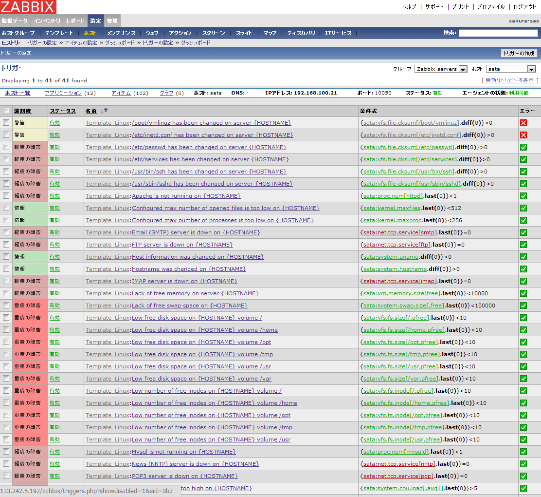 また、一部の監視項目はサーバー上のプロセスやファイルシステムを直接監視して警告を出すものもある。これらについては、ホストの設定」画面で「トリガー」をクリックして表示される「トリガーの設定」画面で確認・設定できる(図18)。