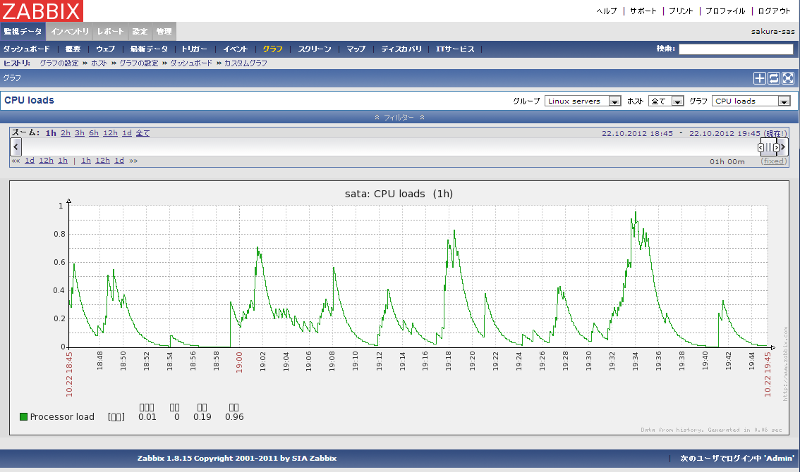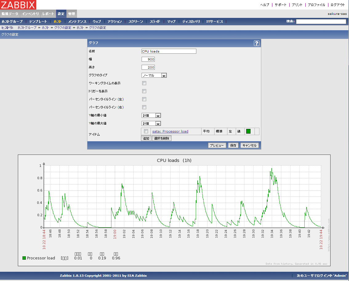 項目にはさまざまなものが用意されているが、たとえばCPUの負荷を見たい場合は「Processer load」を選択すれば良い。すると「グラフに追加するアイテム」画面に戻るので、ここで「追加」をクリックするとグラフのプレビューが表示される(図25)。