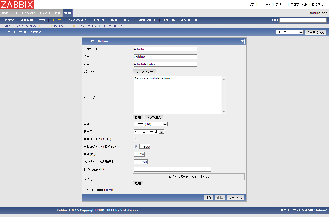メールで通知を行う場合、まずそのメールアドレスを登録しておく必要がある。たとえば登録されているAdminユーザーにメールを送信する場合、メニュー内の「監視」、「ユーザ」を順にクリックしてユーザー管理画面を開き、ここで「Admin」をクリックしてAdminユーザーの設定画面を表示させる(図27)。