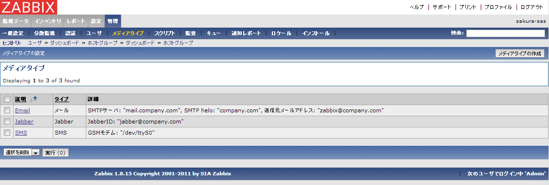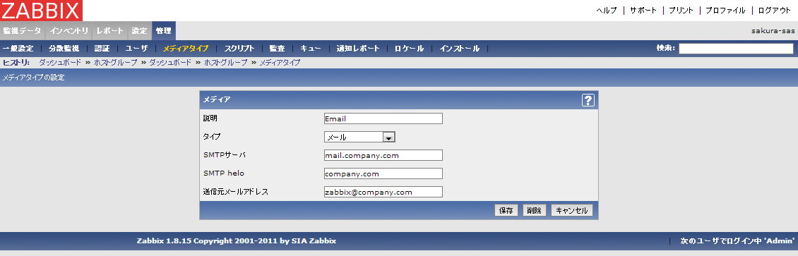 メールアドレスを追加したらユーザー設定画面の「保存」をクリックして設定を保存する。続いて、メニュー内の「管理」、「メディアタイプ」を順にクリックしてメディアタイプの設定を行う(図29)。