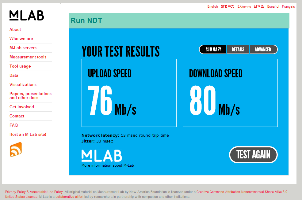 この例では、クライアントからサーバーの速度は73.17Mb/秒、サーバーからクライアントの速度は72.70Mb/秒であることが分かる。なお、公開されているNDTサーバーは研究用として提供されているため、サーバーが停止していたり、また廃止される場合などもあるため注意したい。バックボーンネットワークもサーバーによって異なるので、実行する時間帯などによって結果が変動する可能性もある。あくまで参考程度として利用して欲しい。