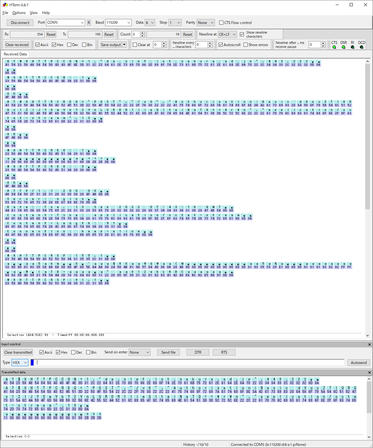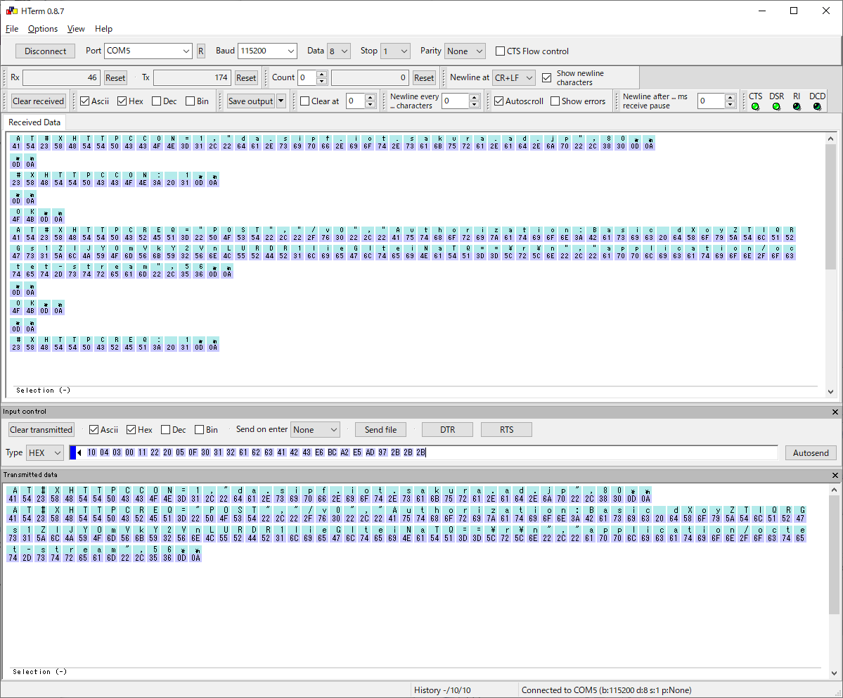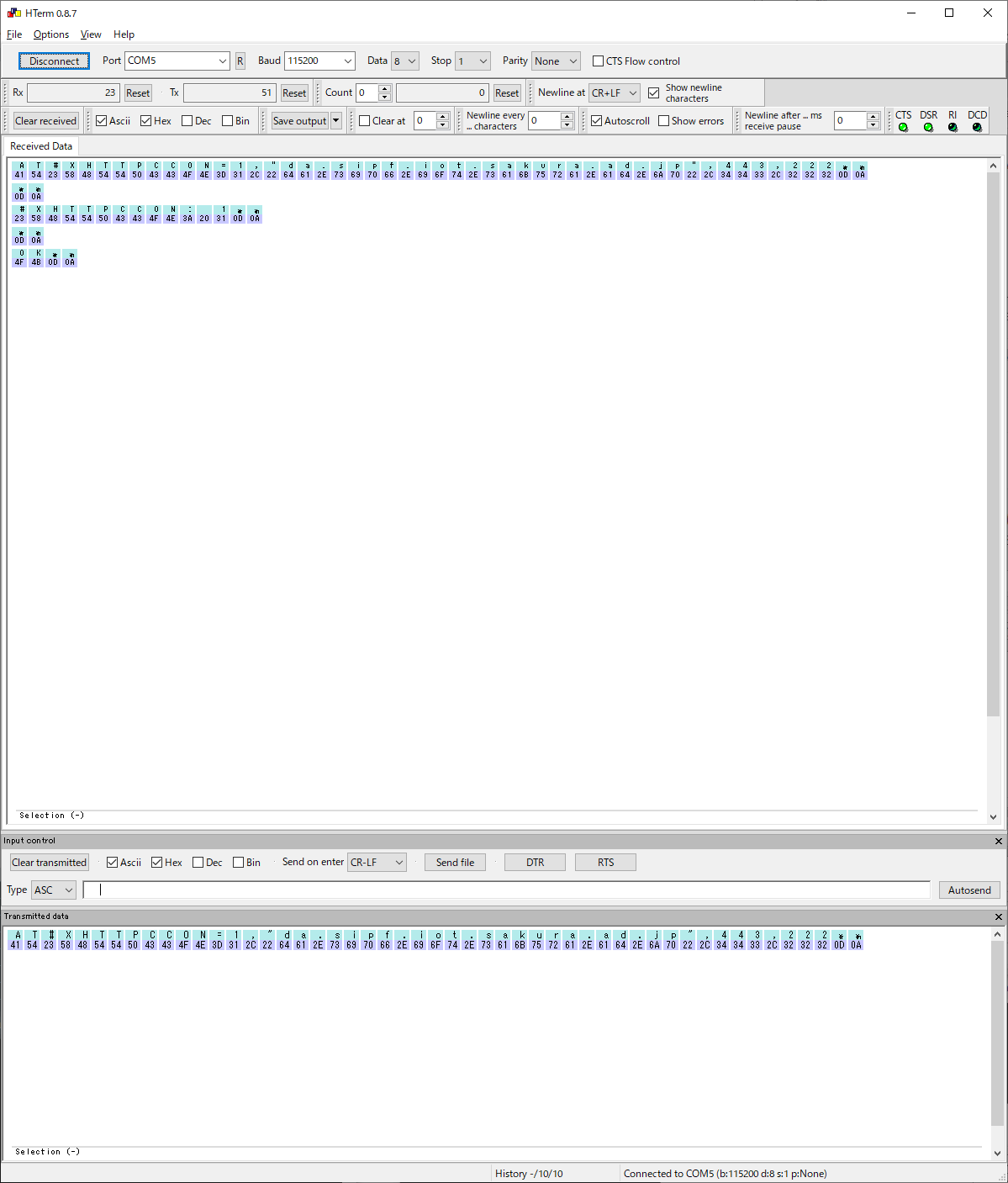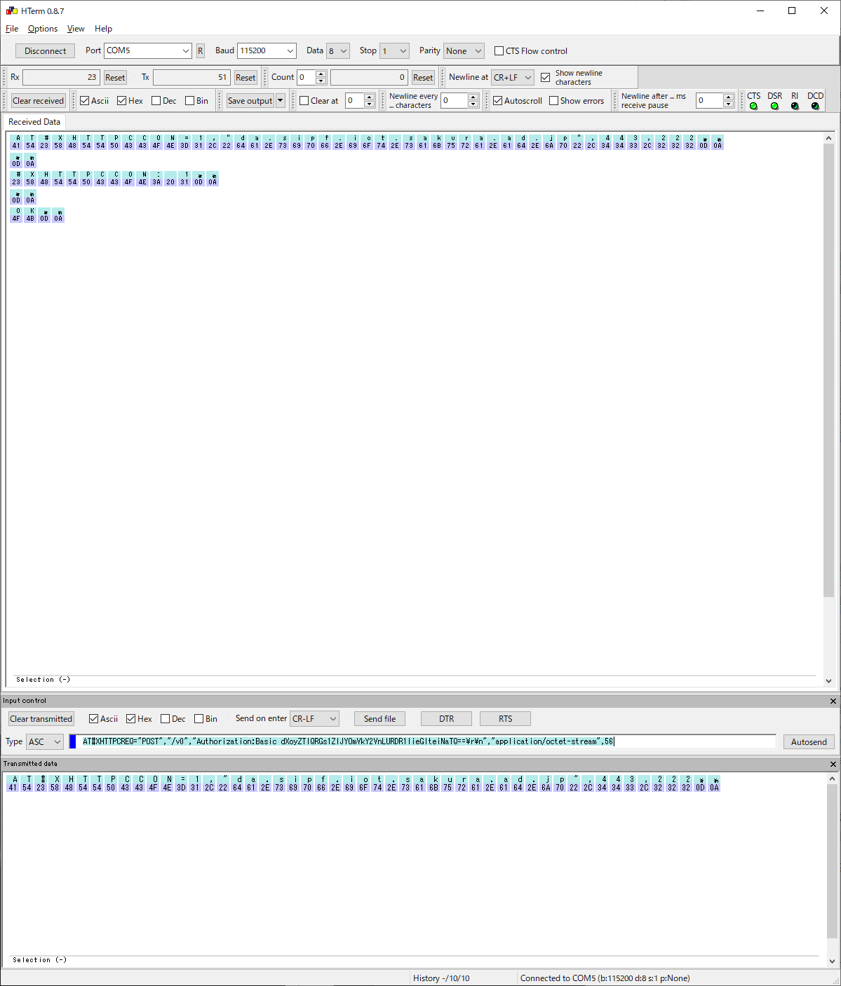 HTermのInput control panelで、TypeにHEXを選択、Send on enterにNoneをして、 テキストボックスに受信要求バイナリのHEX文字列と、終端文字列の+++のASCIIコードをHEXで記入しEnterキーを押します。