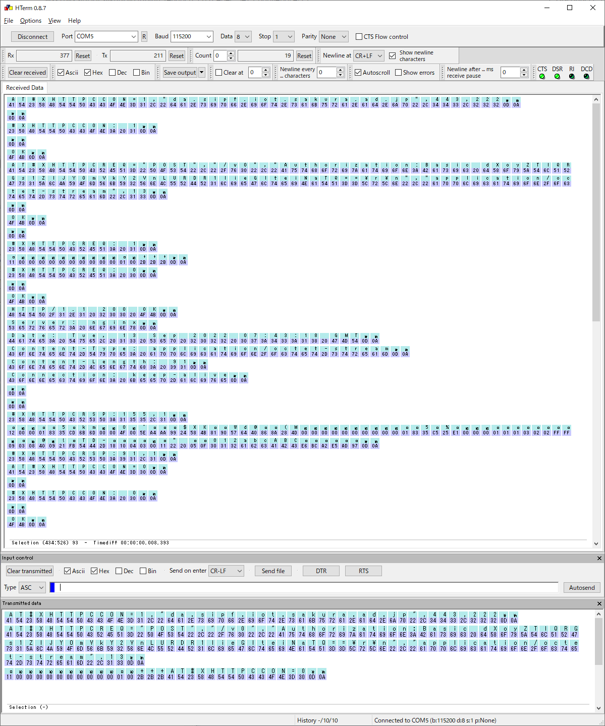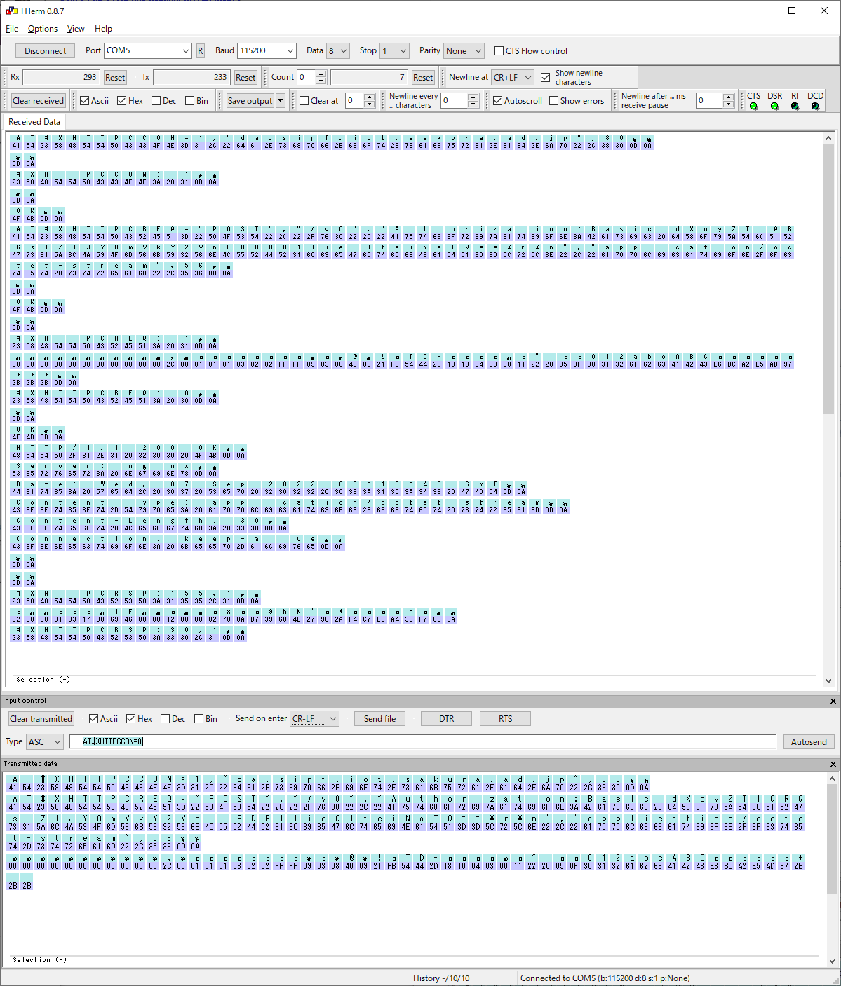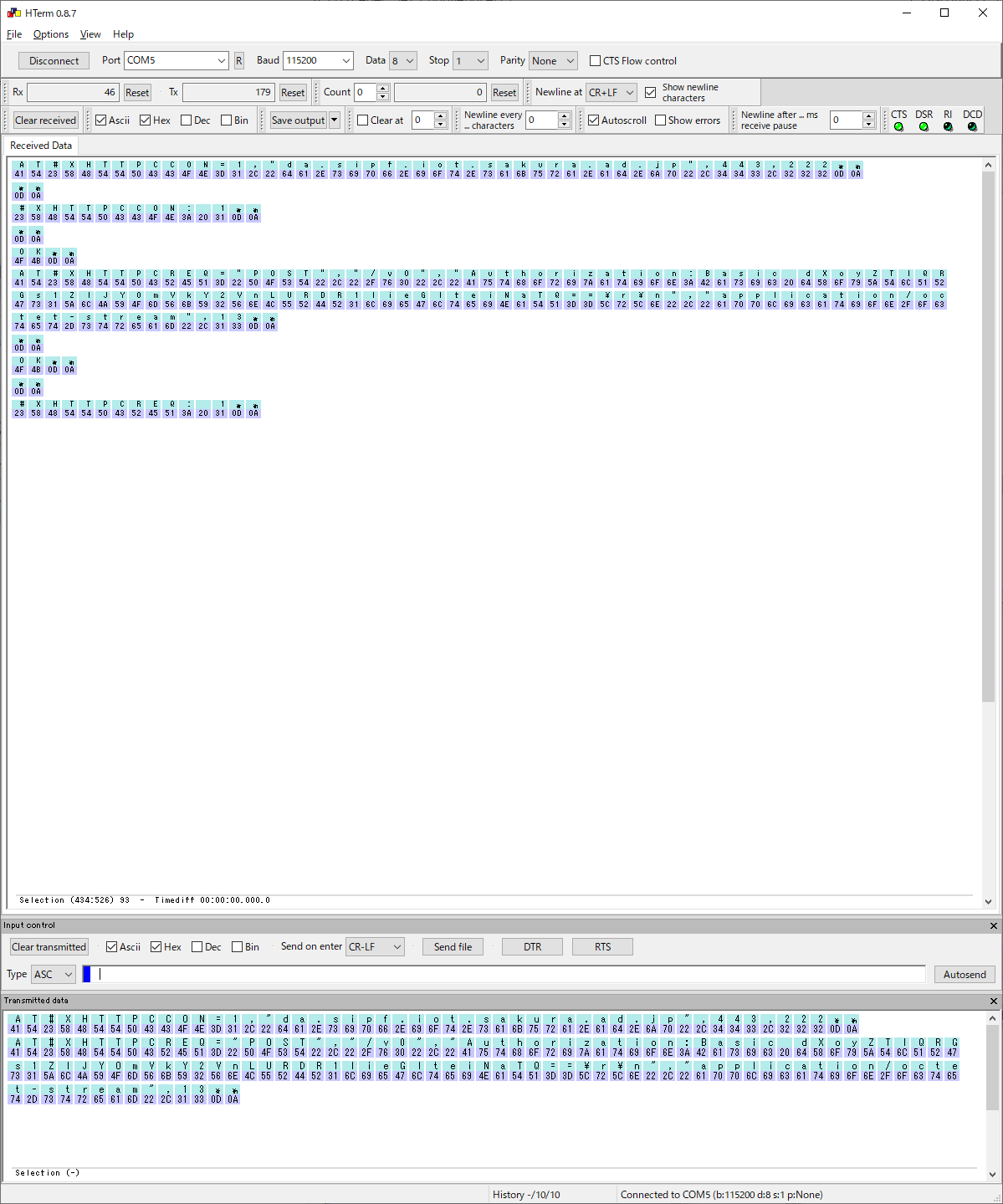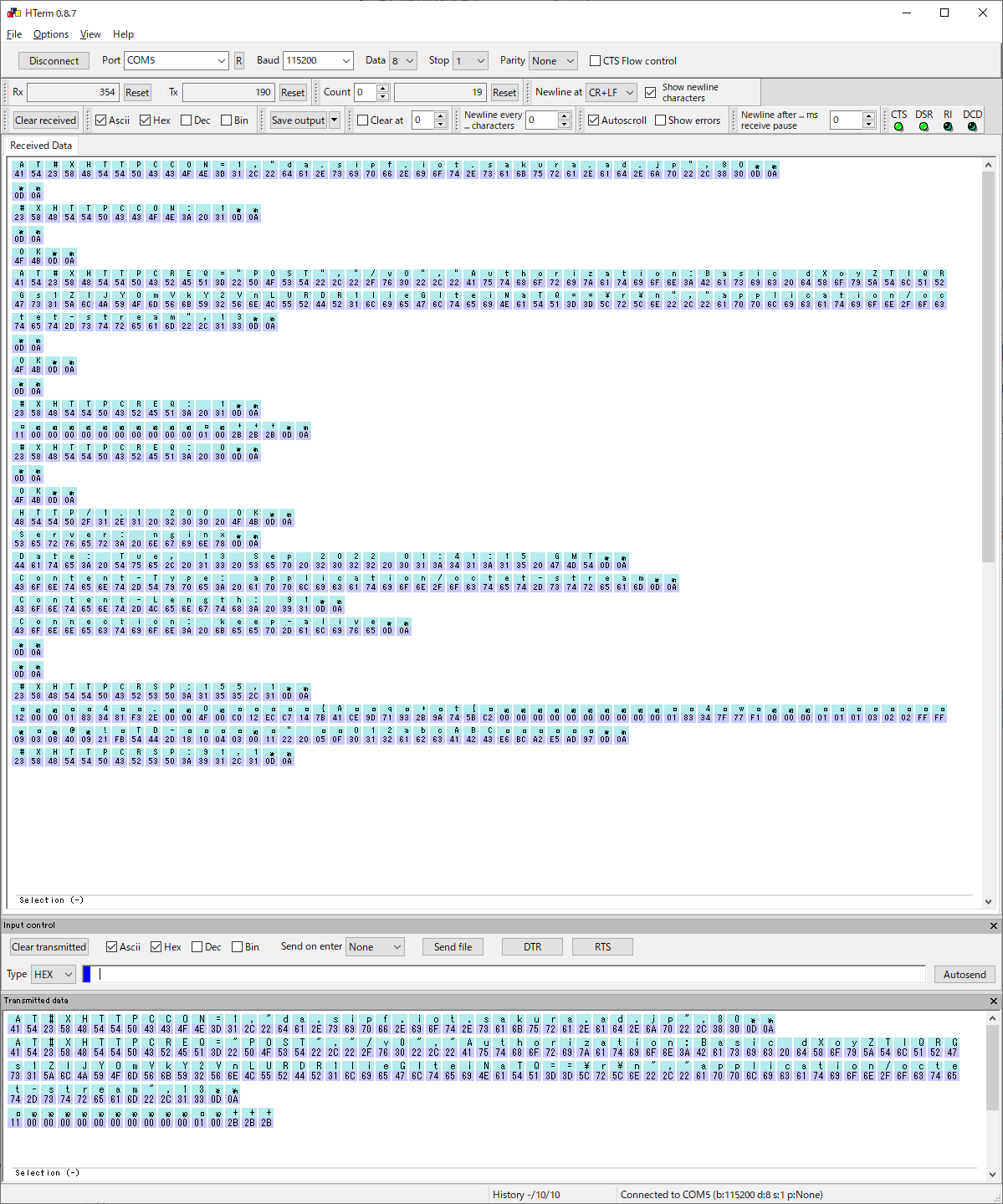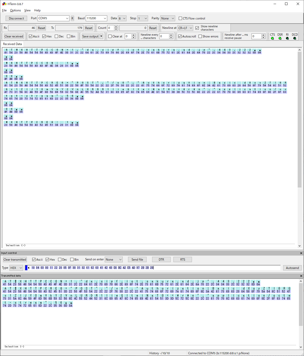 HTermのInput control panelで、TypeにHEXを選択、Send on enterにNoneをして、 テキストボックスに受信要求バイナリのHEX文字列と、終端文字列の+++のASCIIコードをHEXで記入しEnterキーを押します。