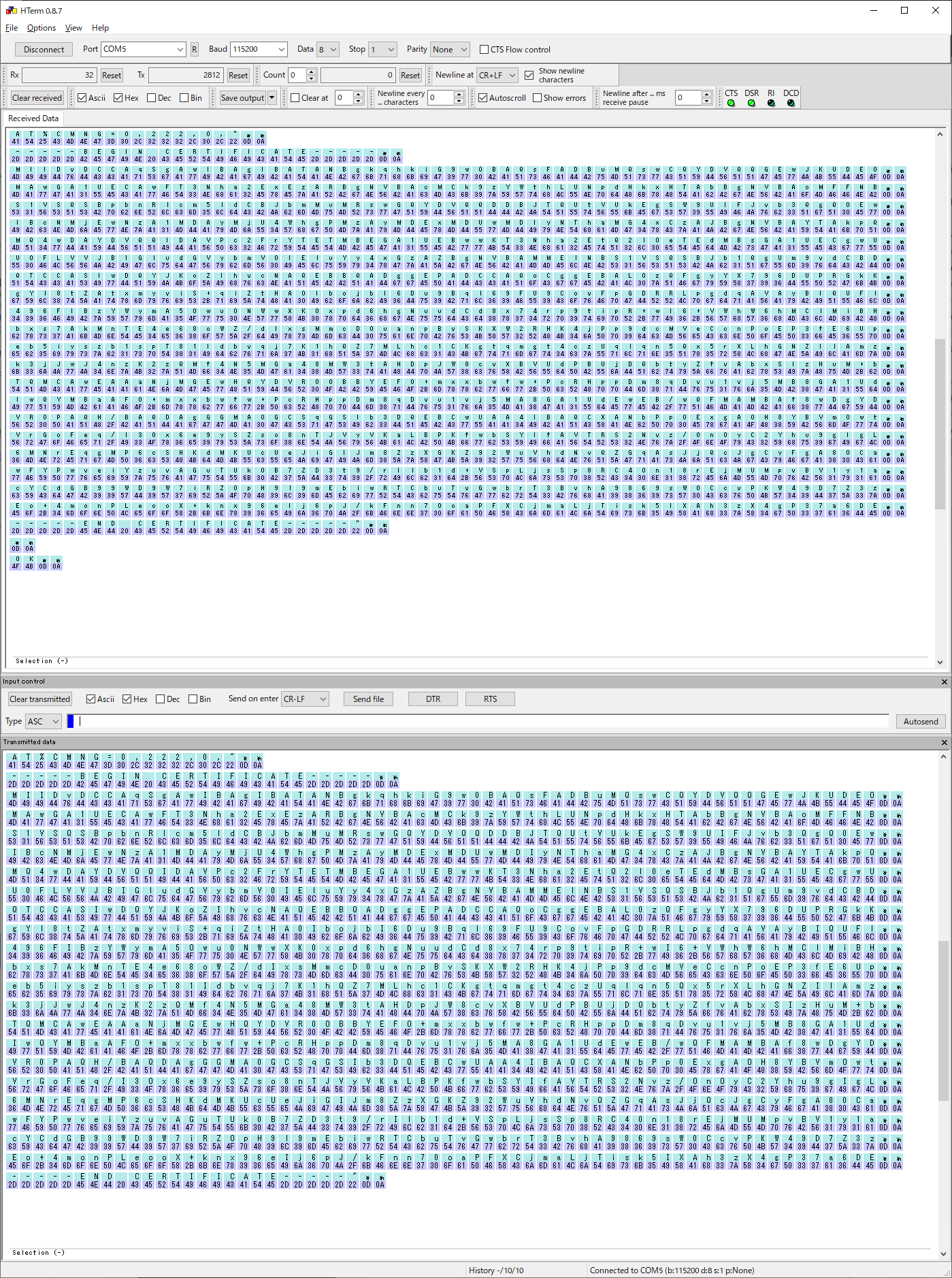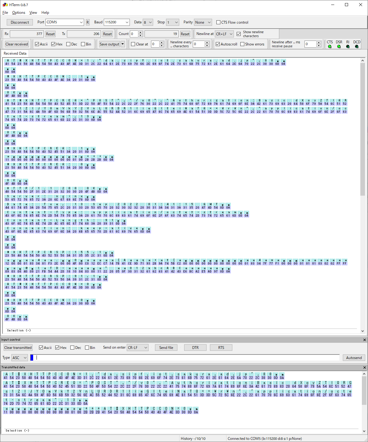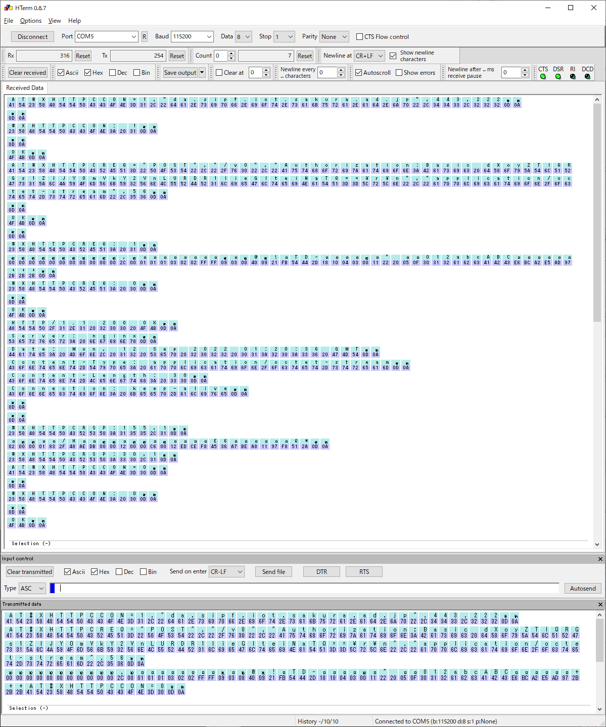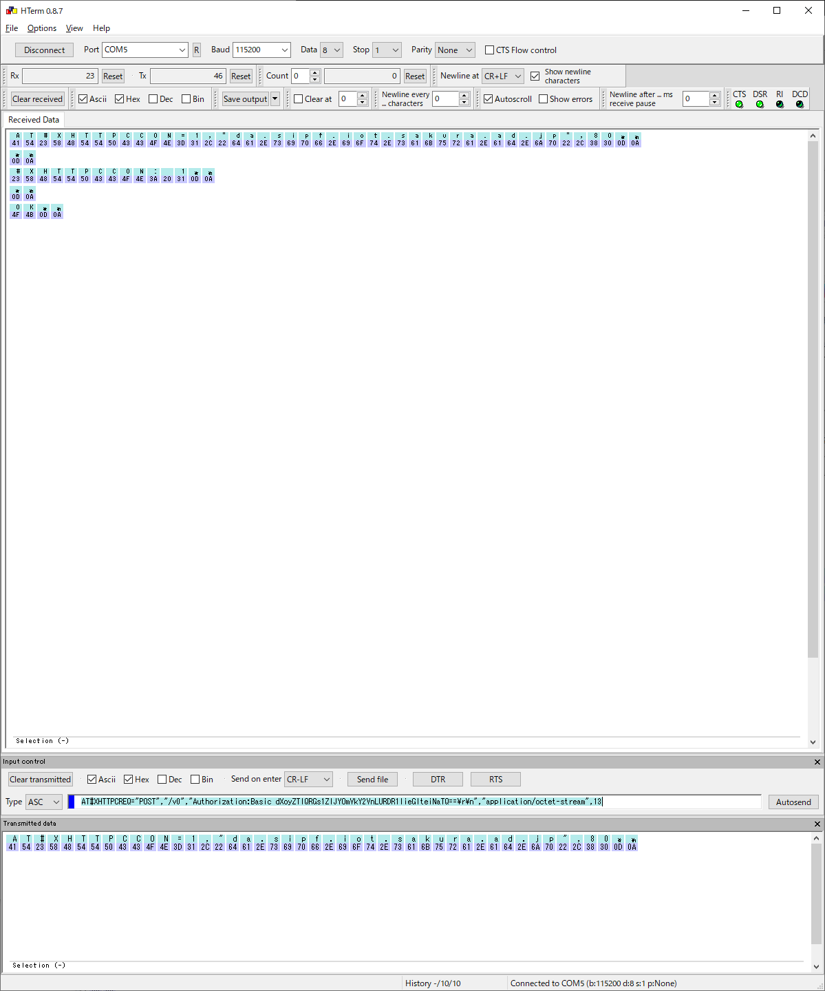 HTermのInput control panelで、TypeにHEXを選択、Send on enterにNoneをして、 テキストボックスに受信要求バイナリのHEX文字列と、終端文字列の+++のASCIIコードをHEXで記入しEnterキーを押します。