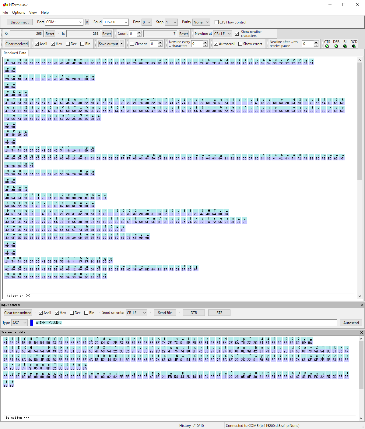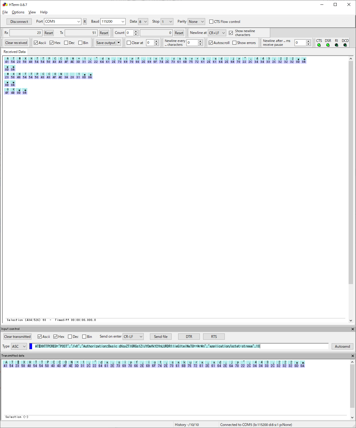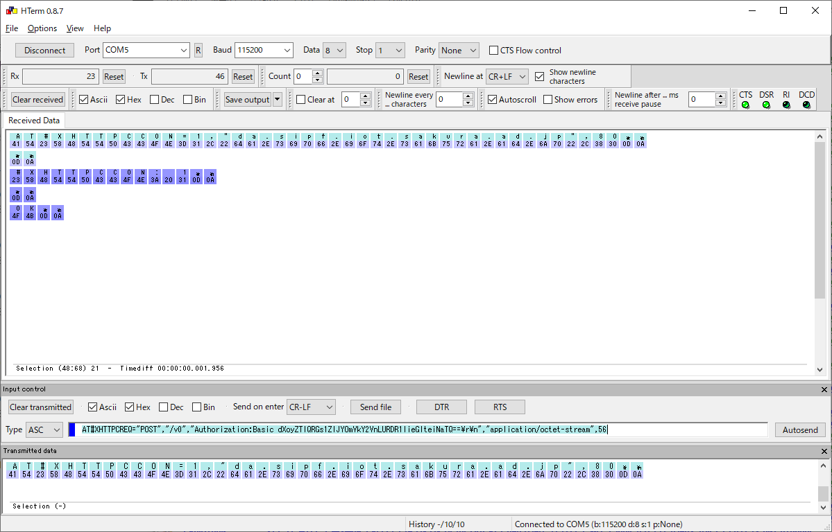 この状態になったらオブジェクトプロトコルの受信要求のバイナリを送出します。Sample Binary for OBJECT_DOWN_REQUEST のバイナリの末尾にbodyの終端を#XHTTPCREQコマンドに伝える+++を付加して送信します。