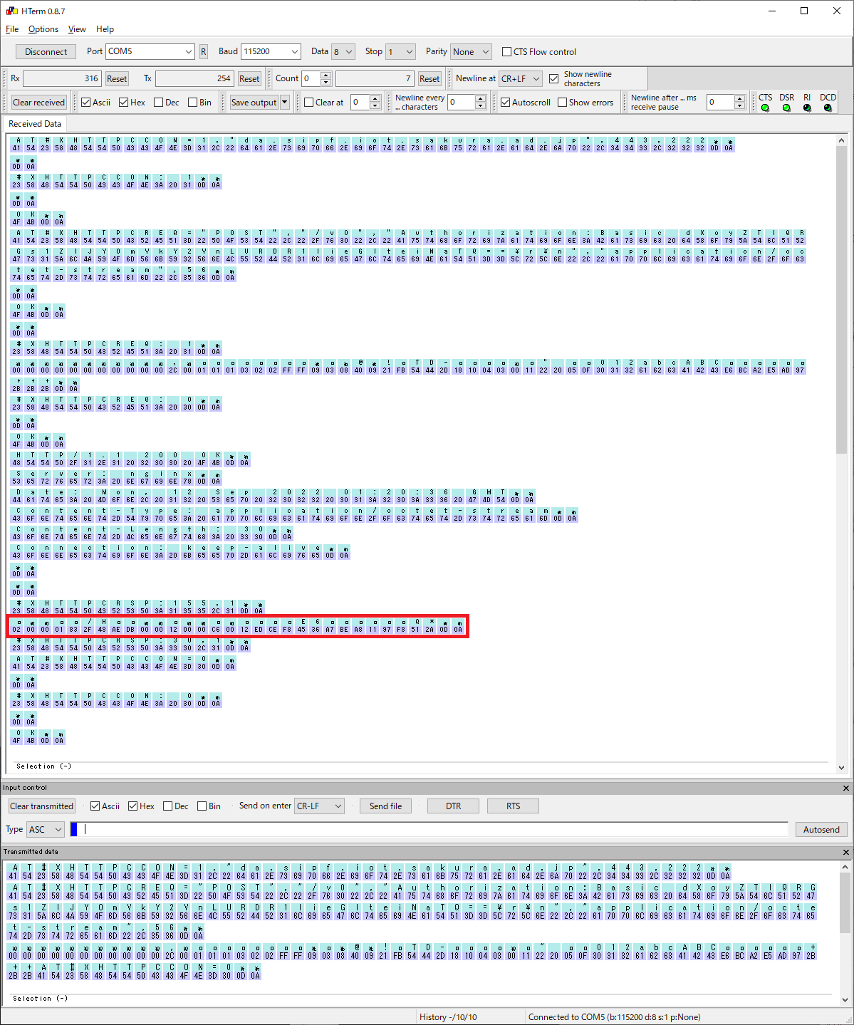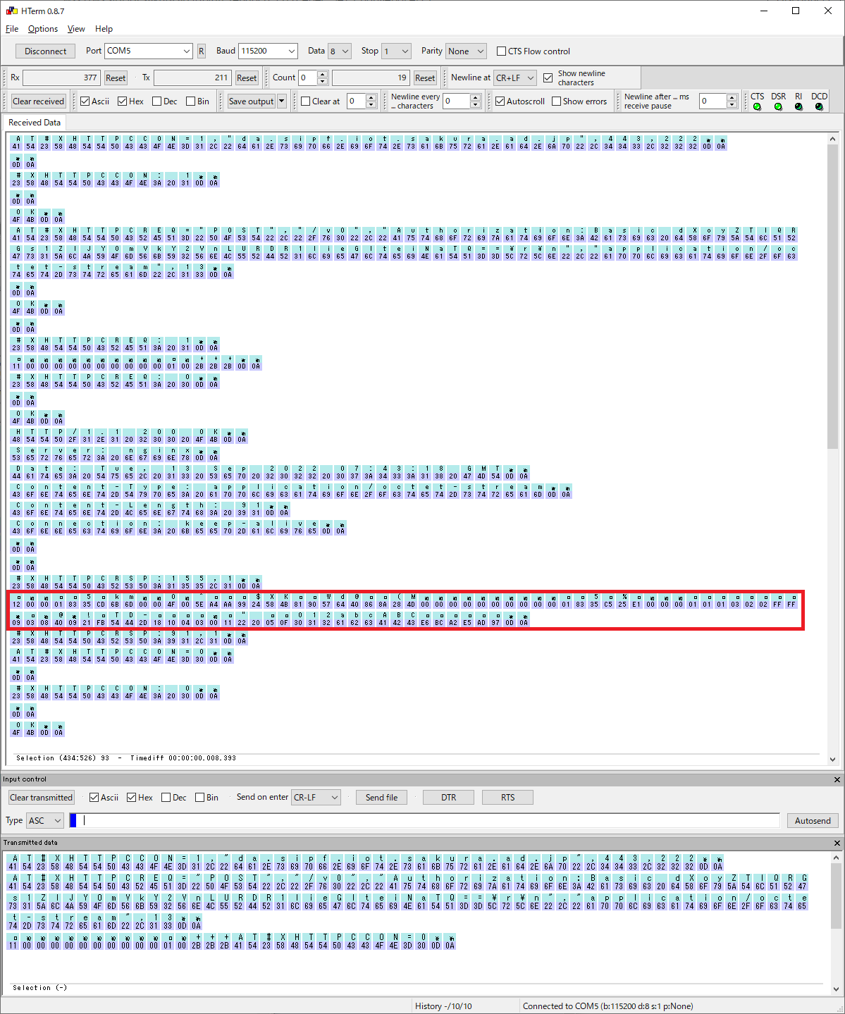 先の#XHTTPCREQコマンドのレスポンス中に、オブジェクト受信要求のコマンドに対する応答も含まれています。 下記の赤枠部がそのデータになります。(末尾のCF-LFはデータには含みません)
