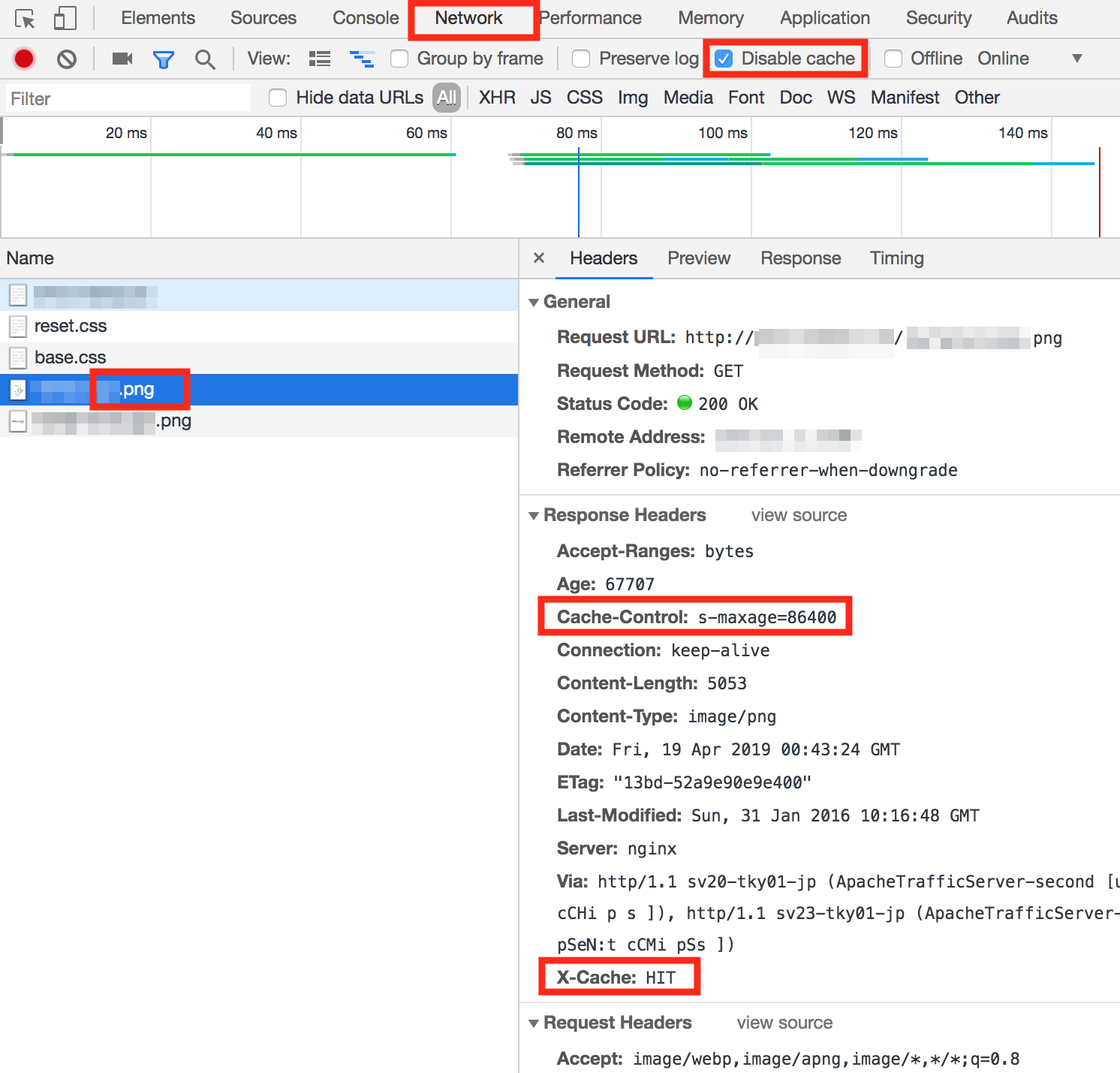 次にキャッシュ対象のファイル(例は、png)を選んで「headers」の「Cache-Control」に、s-maxageで設定している情報が表示されるか確認します。(例は、86400秒) 「X-Cache」が「HIT」になっていれば完了です。