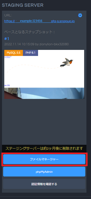 ステージングサーバーが作成できたら、「ステージングサーバーへスナップショットを設定」 のマニュアルに沿って、バックアップをステージングサーバーにセットしましょう。