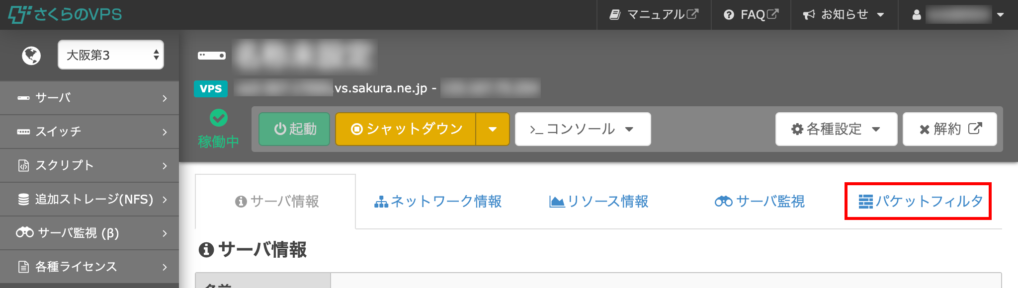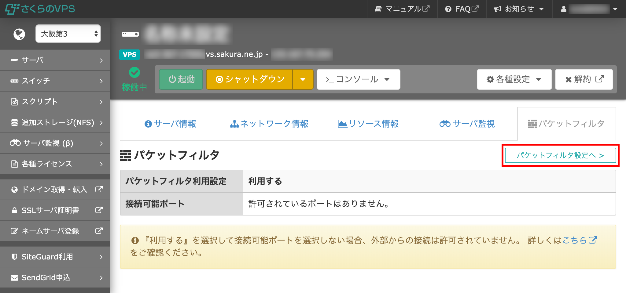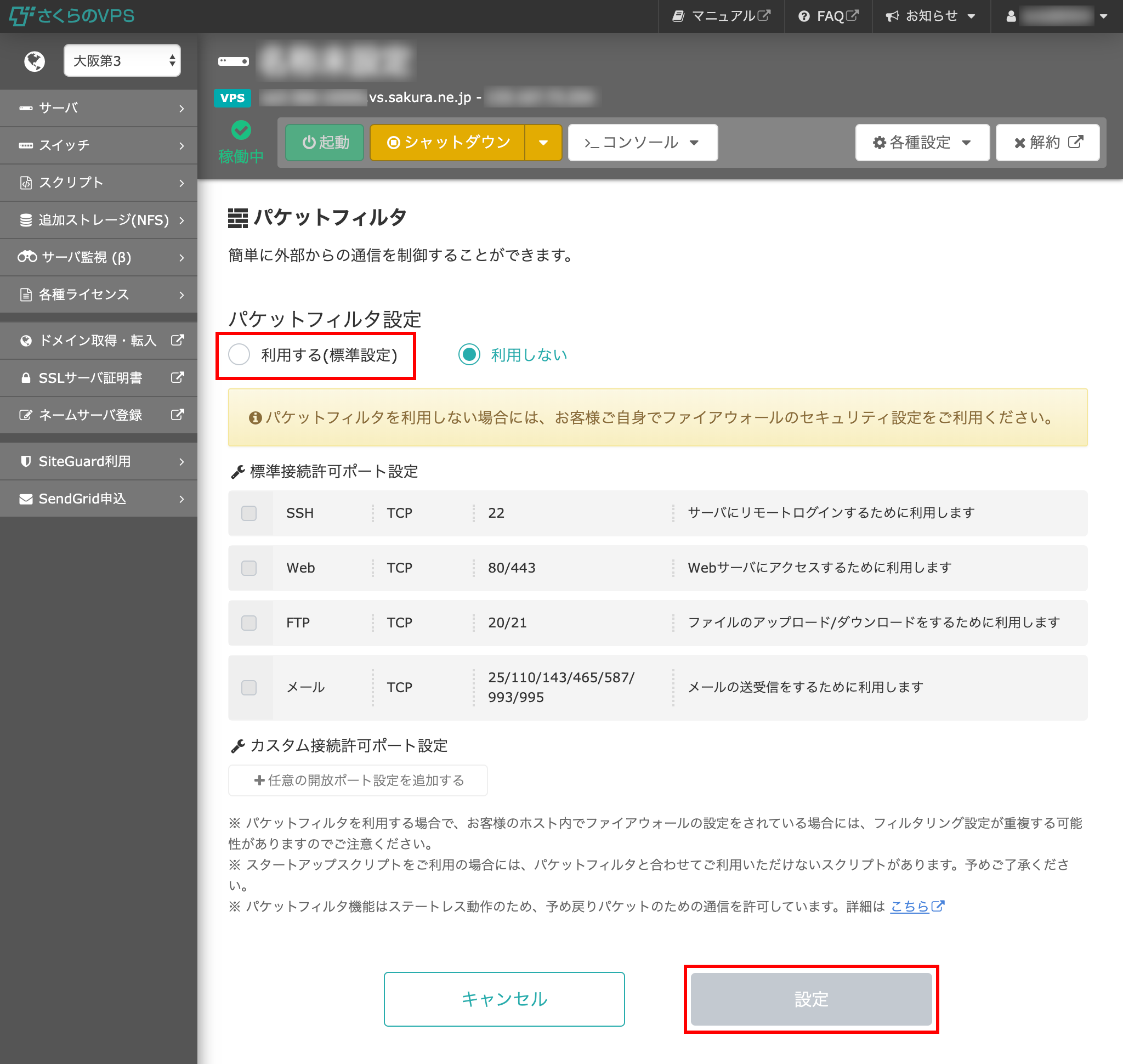 ご契約中の「さくらのVPS」でパケットフィルタ機能を有効化する場合の設定方法です。