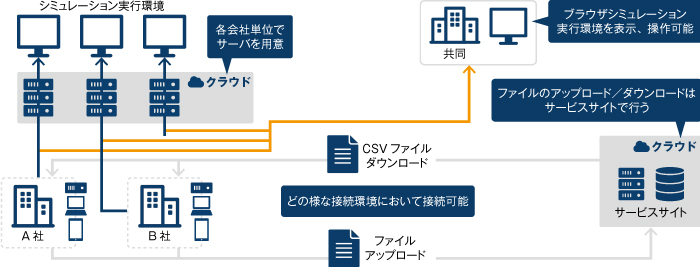 前掲委員会がさくらのクラウド上に構築したプラットフォームを現在6社が試行しています。それぞれのサーバに参加企業は相互にログインすることができます。サーバ内にはモデルをシミュレーションするアプリケーションがあり、リモートデスクトップ上のブラウザ内で利用できます。企業ユーザ間で公開されるファイルには、クラウド上のファイル共有サービスサイトを利用してアップロードできるようになっています。