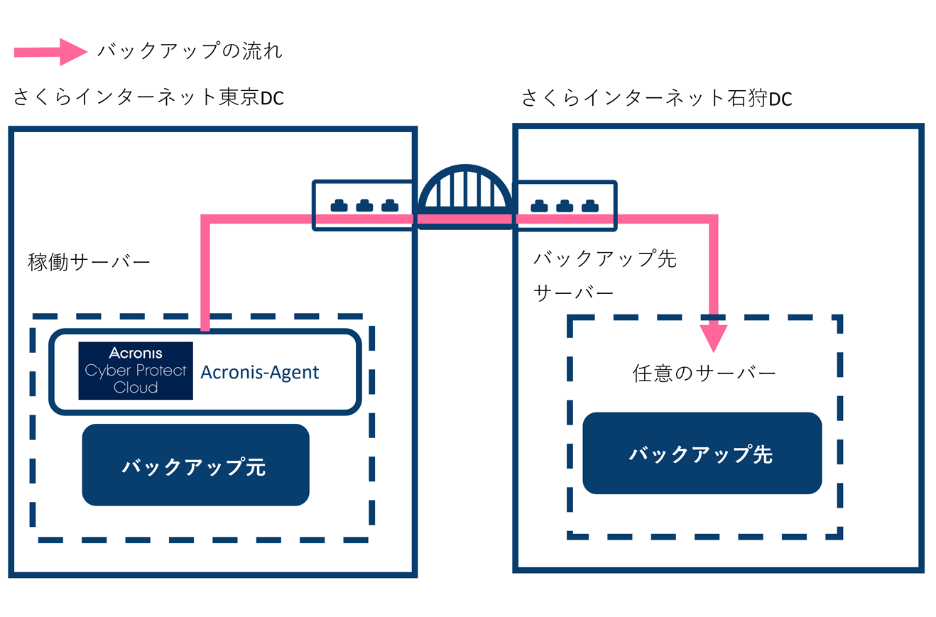 自然災害などによるデータ損失に備えて、バックアップデータを遠隔地に保存したい場合があります。例えば稼働中システムが東京にある場合、バックアップ先サーバーを北海道に構築し、Acronis Cyber Protect Cloudにてバックアップ運用することで、遠隔地バックアップが実現できます。