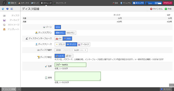 ・「ディスクインターフェース」は「IDE」もしくは「Virtio」いずれかを選択できます。