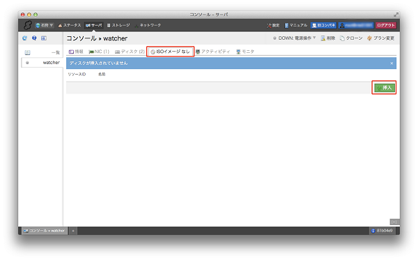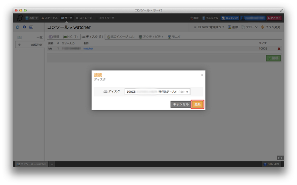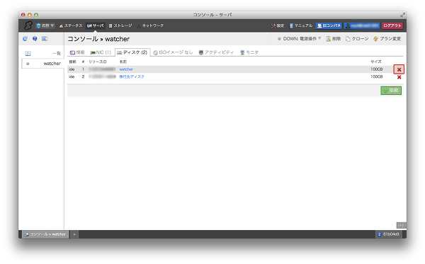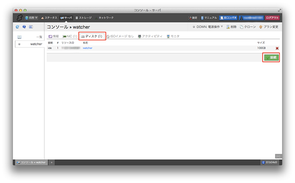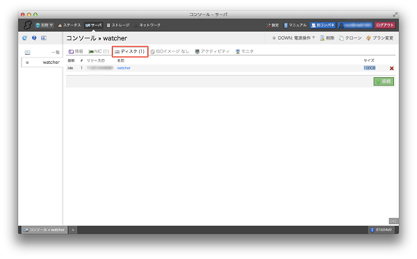 サーバコンソール内の「ディスク」タブから、接続されているディスクのサイズを確認してください。
