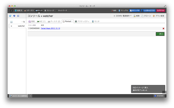 再び移行対象のサーバコンソールを開き、「ディスクタブ」を開きます。