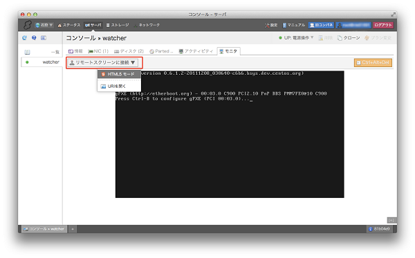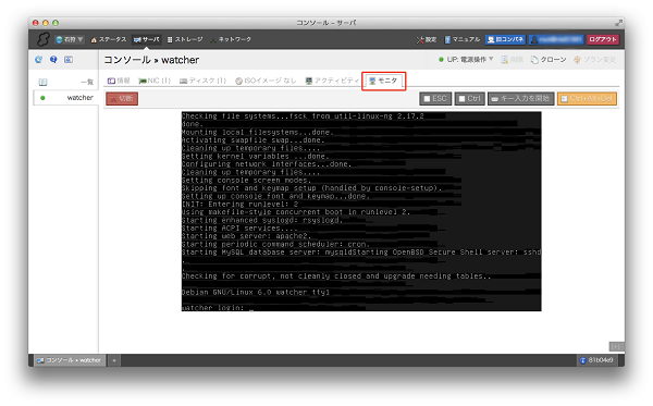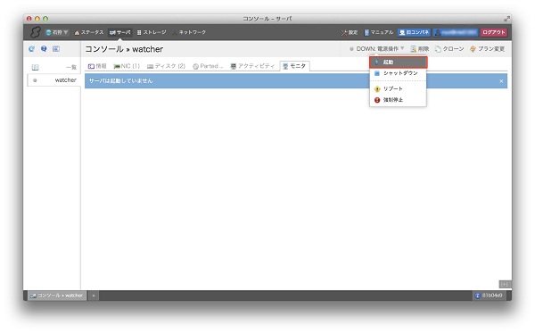 「モニタ」タブからサーバが起動したかどうか確認してください。