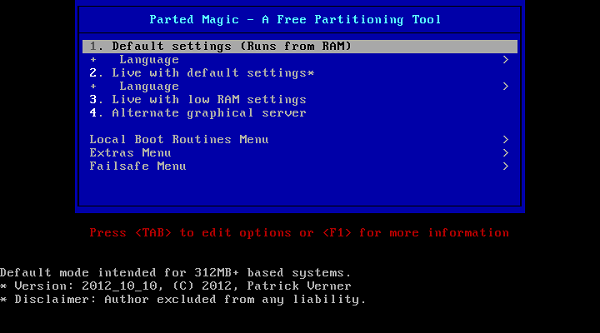 Parted Magic が起動したら、「1. Default Settings( Run from RAM)」を選択し Enterキー を押します。