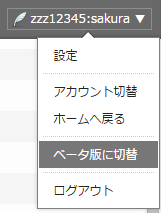 新コントロールパネルへの切り替えは、画面右上のアカウント名をクリックして表示されるメニュー内で「ベータ版に切替」を選択することで切り替えができます。