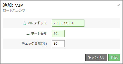 | VIPアドレス | ロードバランサが受け持つ仮想IPアドレスを設定します。 |