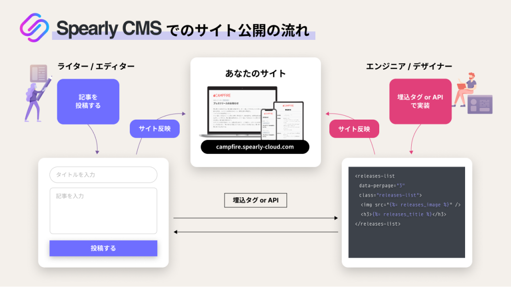 Spearly CMSは、WEBサイトの記事や画像など、皆様のコンテンツを手軽に自由に管理・配信することが可能なヘッドレスCMSです。Spearly CMSで管理しているコンテンツは、埋め込みタグやAPIを用いて、簡単にサイトに埋め込めます。
