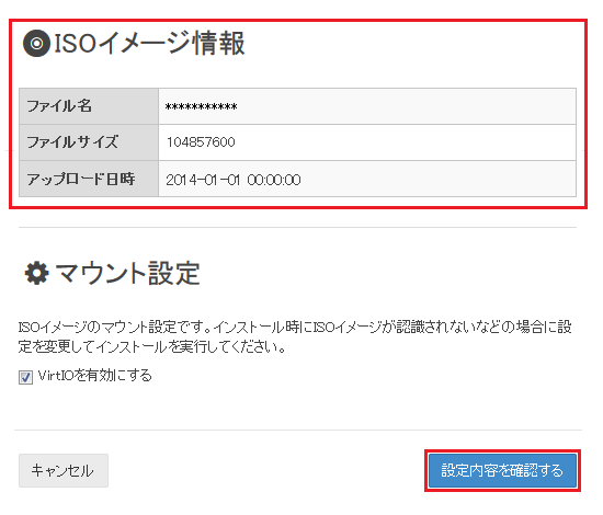 アップロード後、ISOイメージの項目にアップロードした「ISOイメージ名」が表示されますので、確認の上